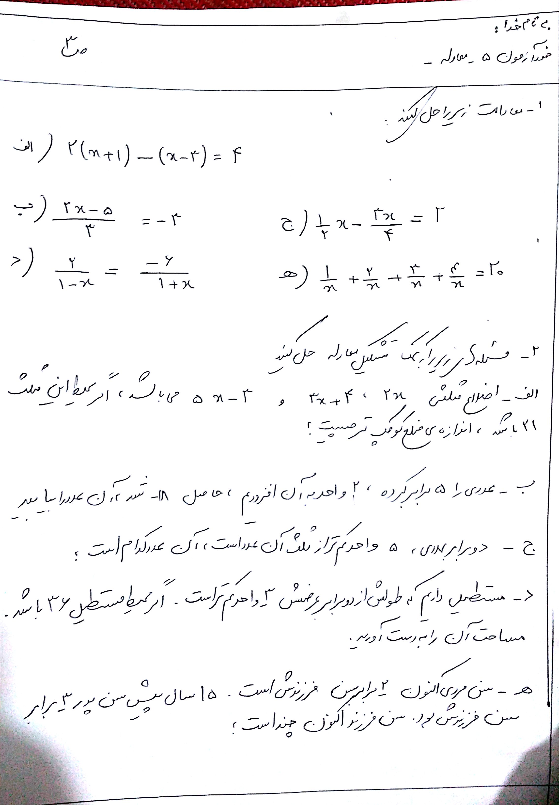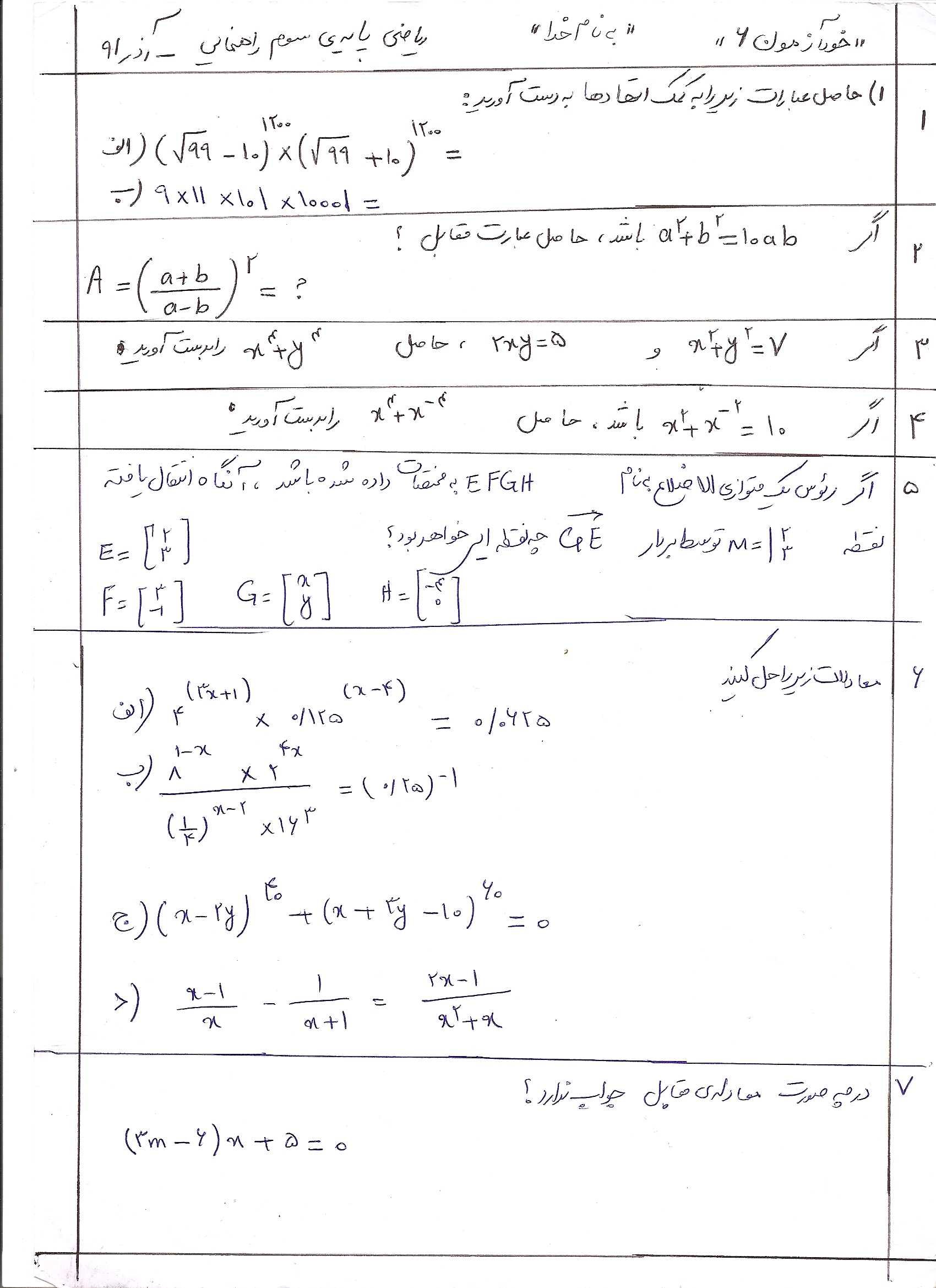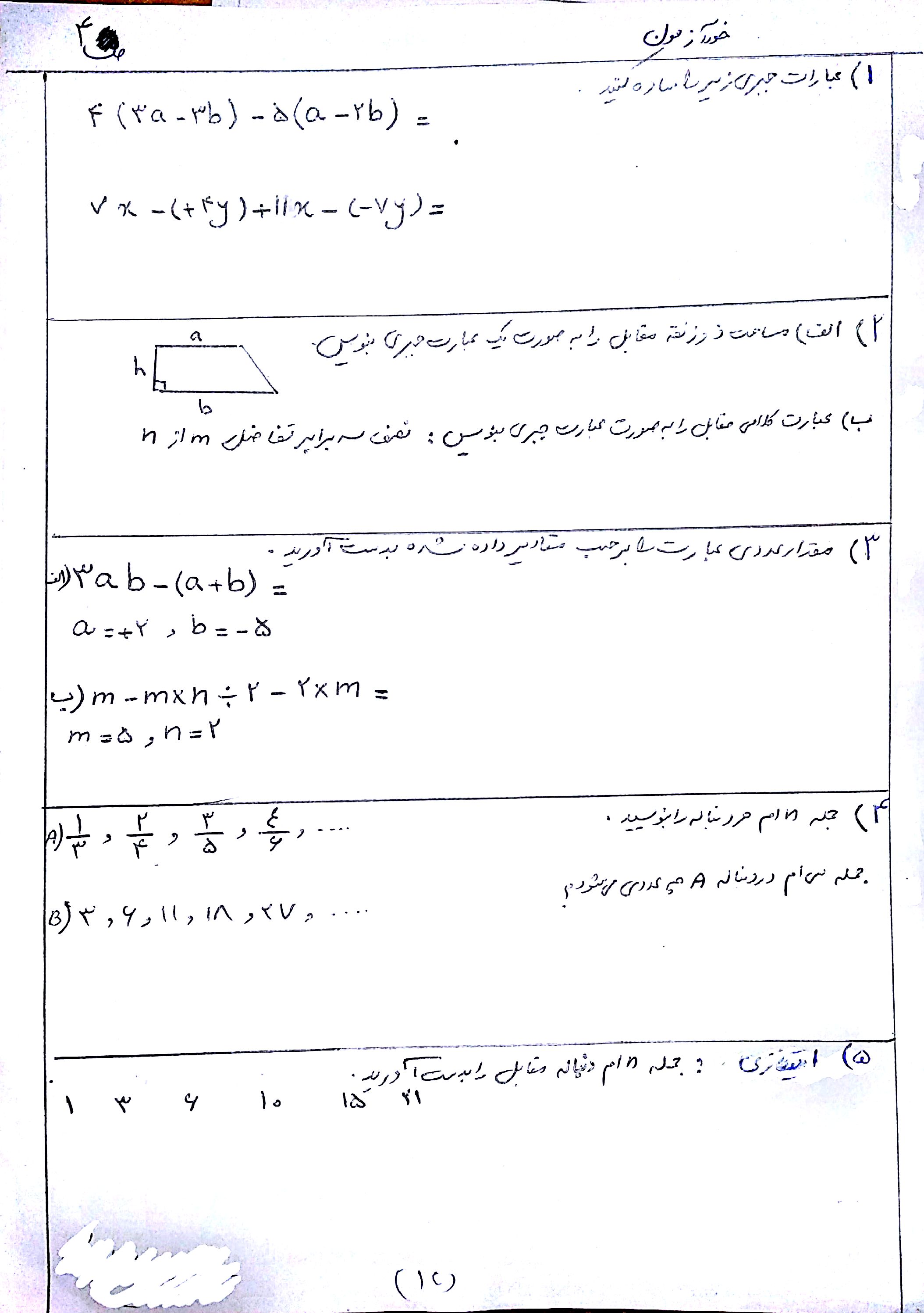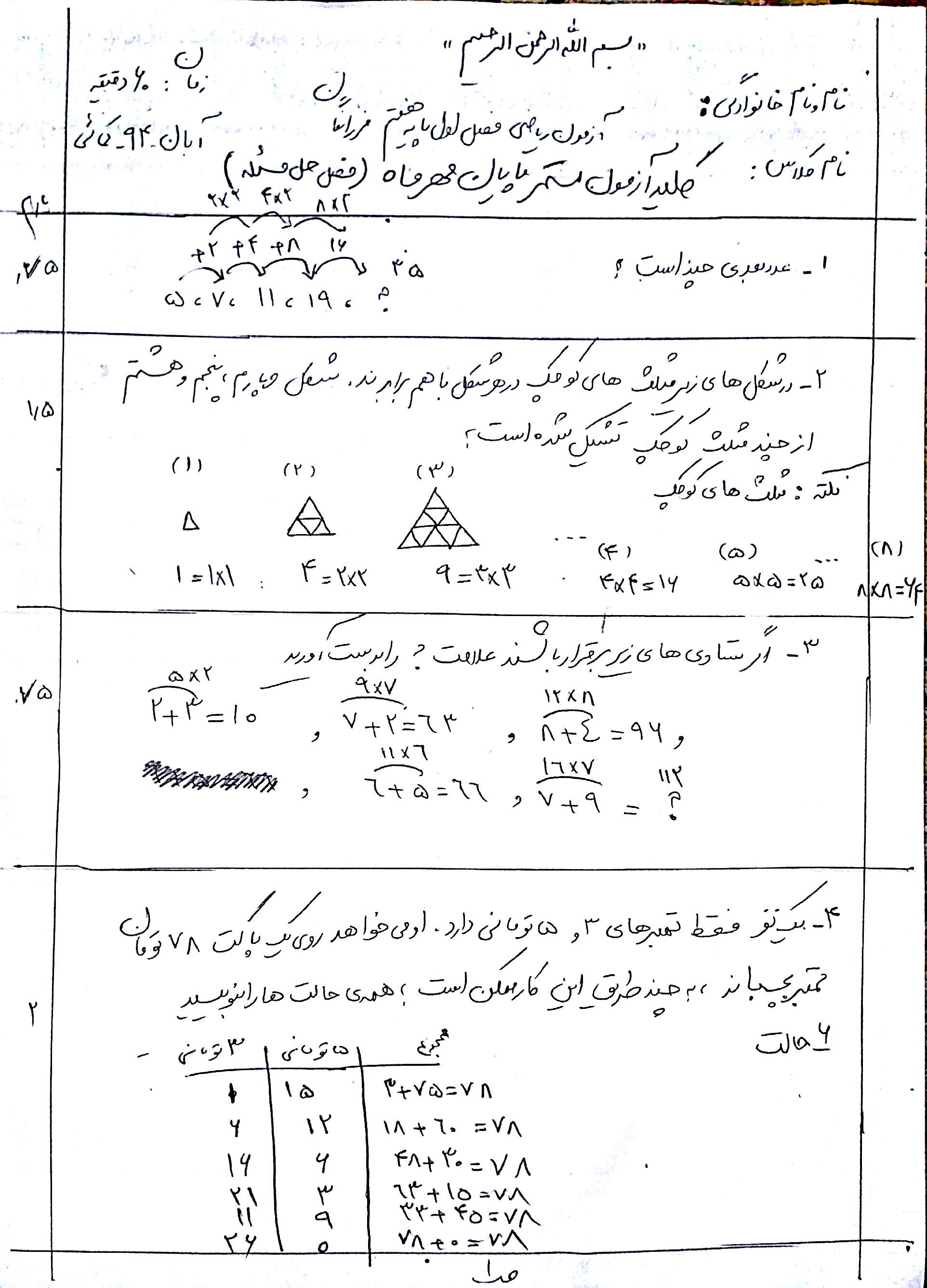 کلید آزمون ریاضی پایه ی ( هفتم فصل حل مسئله )